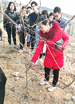 3月18日上午,葡萄与葡萄酒工程1401班全体同学,在屈慧鸽、宋建强、栾丽英三位老师的指导下,在学校后山葡萄园开展了“春季葡萄园田技能训练”。屈慧鸽老师以几种不同的枝型为例,结合葡萄枝条的实际长势,给同学们示范了春季葡萄的修剪方法并进行详细说明。同学们根据老师所讲的内容,在三位老师的分组带领下,进行实践操作,并逐渐掌握春季葡萄枝条的修剪要领。(生命科学学院 撰稿:屈慧鸽、郑思倾、李欣芳 审核:王昌留)