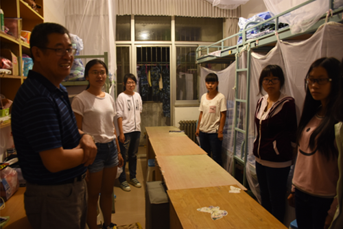为了了解新生入学后的生活情况,延续生命科学学院几十年来的优良传统,2016年9月11日晚,生命科学学院党总支书记刘新海,党总支副书记薛君华,副院长靖美东,团总支书记金鑫老师、都婷婷老师、吴震老师以及16级全体班主任老师走访了2016级新生宿舍,给新生带去问候和关怀。