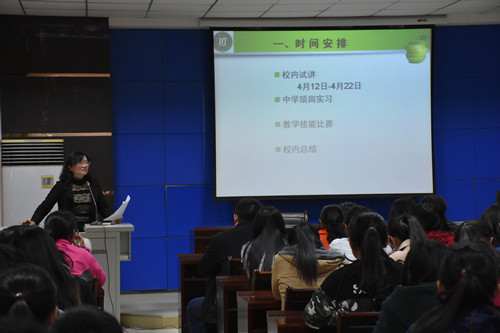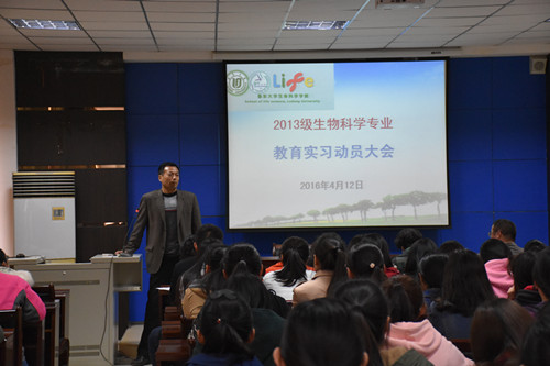为提高应用型人才培养质量,加强生物科学专业教育实习的管理,生命科学学院于4月12日举行2013级生物科学专业教育实习动员大会,全体2013级生物科学专业本科生和教育实习指导教师参加大会。副院长王昌留教授到会做实习动员讲话,生物教学论课程负责人卜庆梅教授对教育实习总体安排做部署。