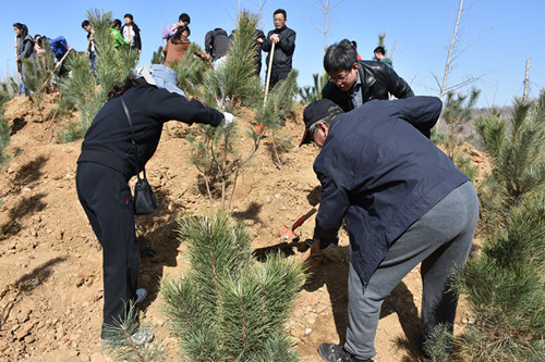参加植树活动的老师和同学们三五人一组,分工合作开始植树,挖坑、栽植、覆土,大家对每一个环节都认真对待。植树现场的劳动场面热火朝天,经过两个小时的奋战,小山坡变成了绿色的海洋。