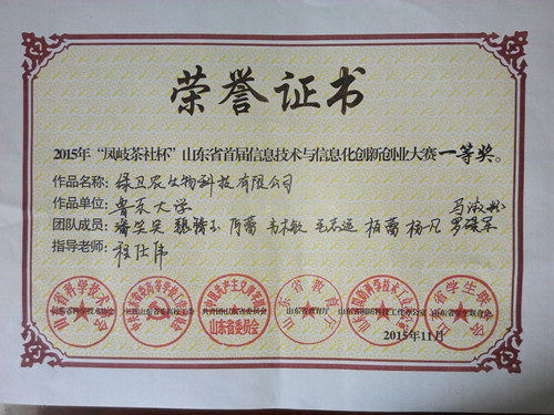 近期,2015年“凤岐茶社杯”山东省首届信息技术与信息化创新创业大赛举行,由我院程仕伟教师指导,潘笑笑、魏腾玉等9位同学组成的团队以作品“绿卫农生物科技有限公司”参加比赛,选手们经各比赛环节的激烈比拼,最终荣获一等奖。