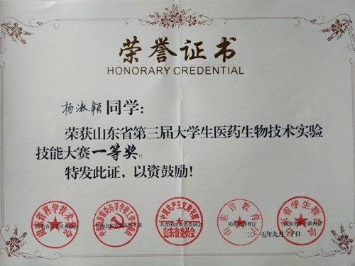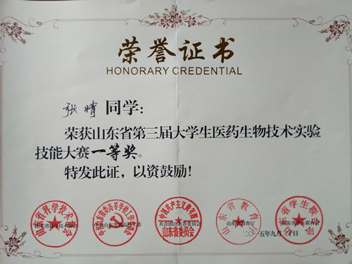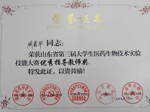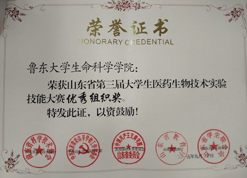 9月19日至20日,由山东省科协、省委高校工委、团省委、教育厅、学生联合会共同主办,山东省免疫学会、山东省医药生物技术协会和滨州医学院药学院联合承办的山东省第三届大学生医药生物技术实验技能大赛在滨州医学院举行,我院生物技术专业学生杨淑颖、张晴两位同学荣获一等奖,周菊华教授被评为“优秀指导教师”,生命科学学院荣获“优秀组织奖”荣誉称号。