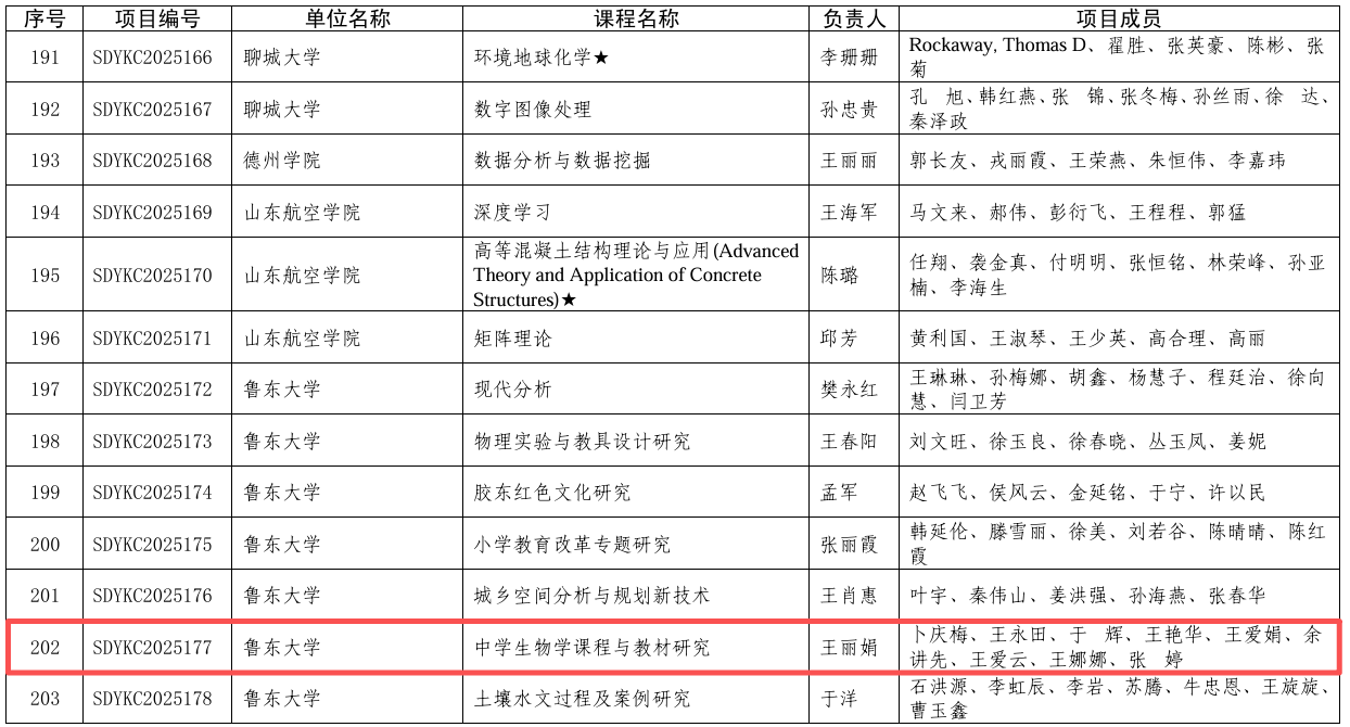 近日,山东省教育厅公布了2025年山东省研究生优质教育教学资源项目立项建设名单。我院申报的《中学生物学课程与教材研究》课程成功入选,被评为2025年山东省研究生优质课程。该课程由王丽娟担任负责人,卜庆梅、王永田、于辉、王艳华、王爱娟、余讲先、王爱云、王娜娜、张婷等教师共同参与建设。